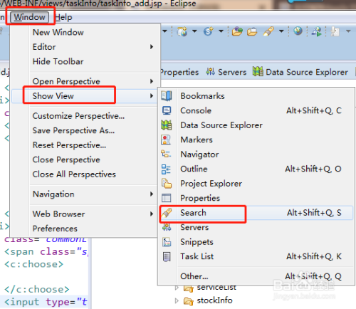 若是没有呈现search标签,可依次点击 Window -->Show View --> Search调出Search标签。