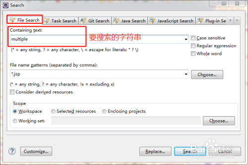 然后选择“File Search”标签,在Containing text中输入要搜刮的字符串。