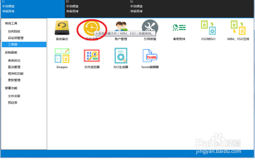 双击打开dism++,进入常用东西下的东西箱,单机系统还原,跳出对话框如下