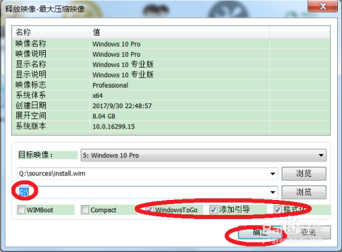 在方针镜像下第一个浏览中选择系统镜像下的sources>install.wim,然后再方针映像下选择响应的操作系统。在第二个浏览选择中选择想要制造WTG的U盘,然后勾选WTG,添加指导和格局化,最后确认。