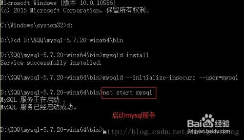 输入 net start mysql 启动办事,OK当作功,如下图所示: