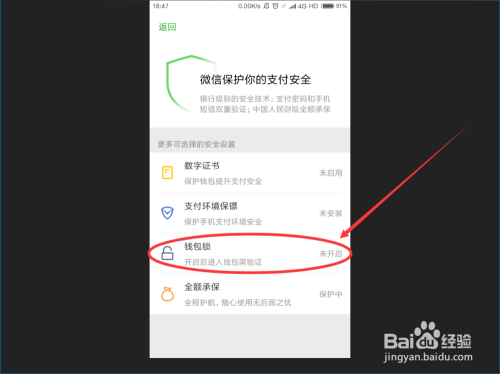 我们来到微信付出平安页面之后,我们找到‘钱包锁 ’按钮,点击打开微信钱包锁页面 。