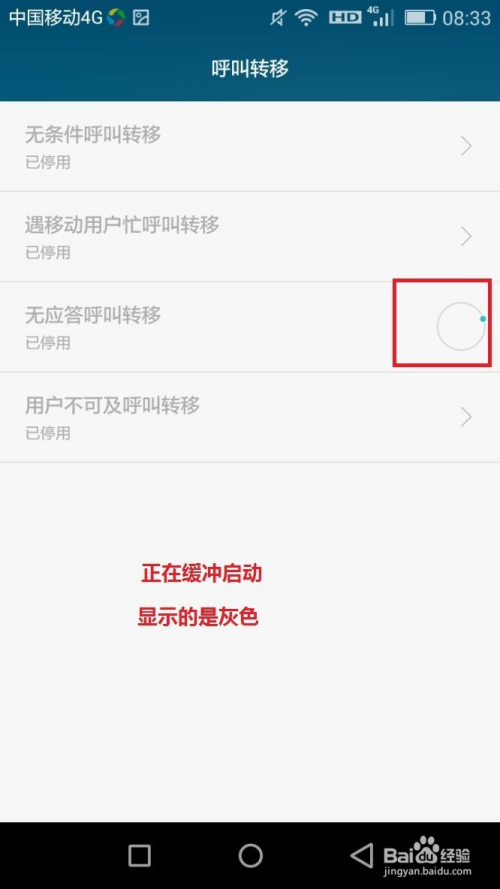 打开呼叫转移之后,要缓冲一下,它要启动设置的功能(刚打开是灰色的,缓冲启动后就可以正常设置了),同样也有四个选项(如下图),按照本身需要进行选择)。