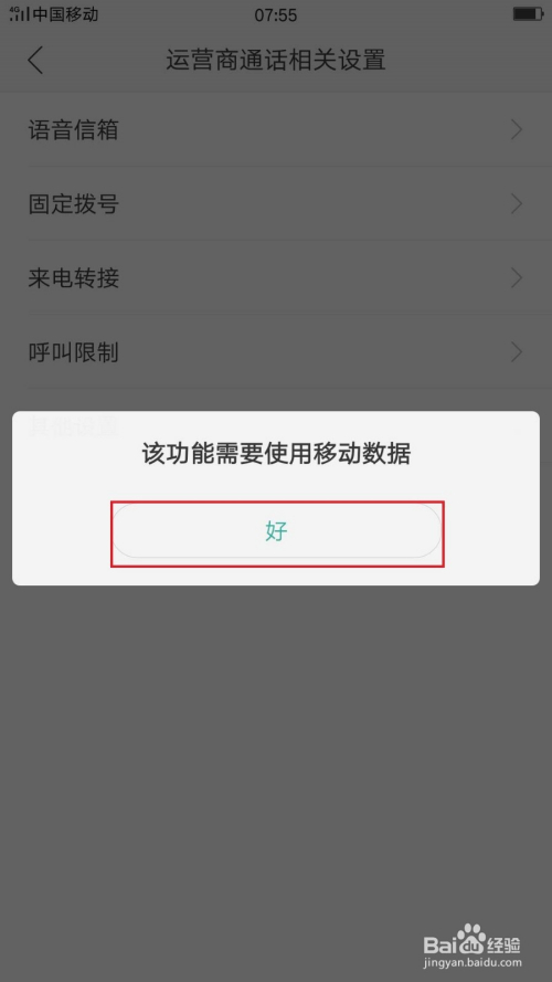 首先打开手机的设置选项——点击德律风——选择:运营商通话相关设置——选择:来电转接,这时会弹出提醒:该功能需要利用移动数据——点击:好——然后开启移动数据。