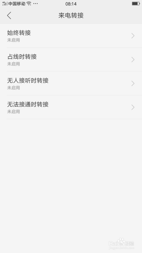 开启移动数据后,再点击来电转接就可以进入到设置转接界面,有四个转接德律风的设置:始终转接、占线时转接、无人接听时转接、无法接通时转接。