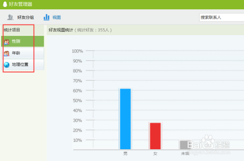 默认进入性别页,如图会显示总数,以及各类性此外比例,注重因为有的设置不公开,所以有三类。