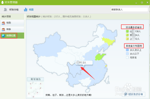 最后,切换到区位选项上,则会只显示我国地图,固然老友中,有将地域设为国外的,地图中并不显示,右侧可看到排前三的地域,将鼠标放在图中某一省上,会显示具体人数。