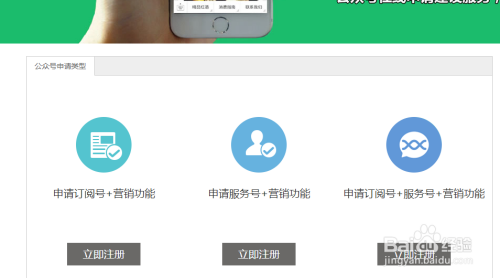 点击进去今后又分当作如下三种,订阅号+营销功能、办事号+营销功能、订阅号+办事号+营销功能,申请的小我的公家号的话就是第一种,若是企业或者是集体的话你就选择三种都可以,点击订阅号+营销功能进行下一步