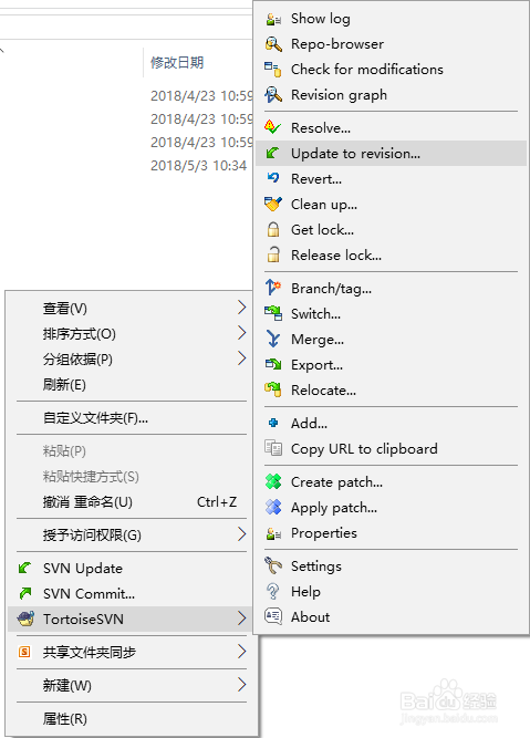 点击TortoiseSVN,我们可以看到Update to Version 可以更新到某一个特定的版本。