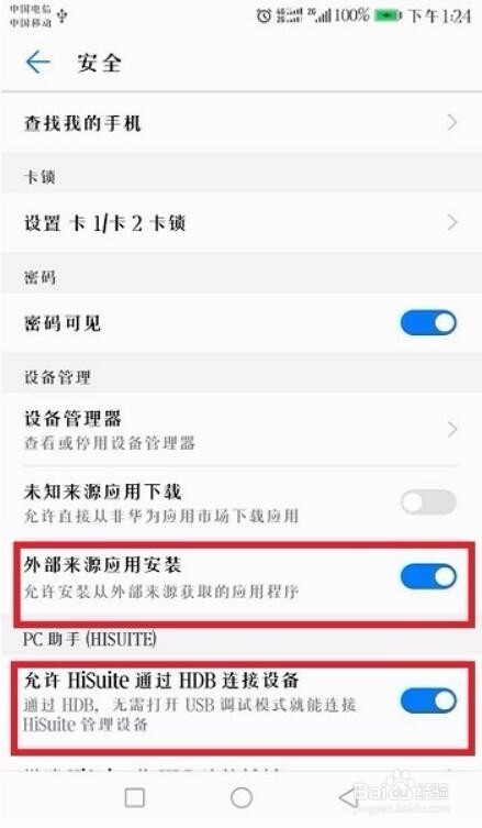 在系统平安中找到 外部来历应用安装,许可HiSuite经由过程UDB毗连设备 打开这两个就可以毗连上了