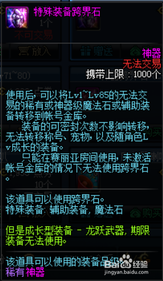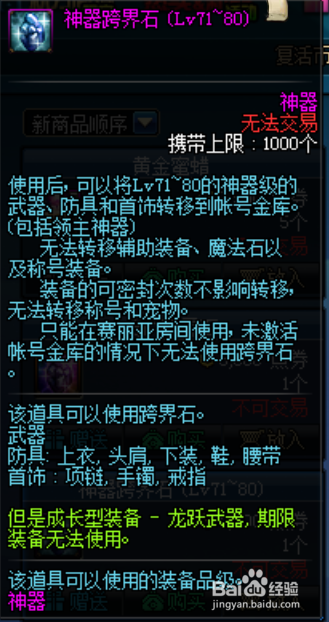 【神器跨界石】可以将 1-70级 神器级的兵器、首饰或防具转移到【账号金库】傍边,可是特别装备不撑持。