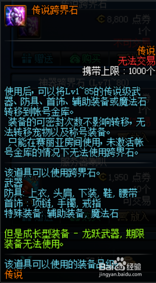 【传说装备跨界石】可以将 1~85 级的所有类型的装备转移到【账号金库】傍边。只可以在赛利亚房间中利用。当作长型装备无法利用。