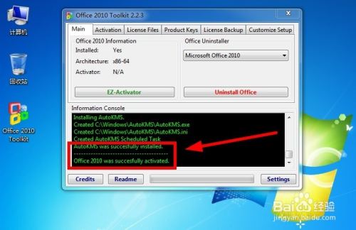 呈现“office 2010 was successfully activated”,申明office 2010当作功激活