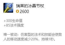 焦点装备5:瑞莱的冰晶节杖 增添生命值和神通强度,同时被动结果可以对仇敌进行减速,增添自身的团控能力。