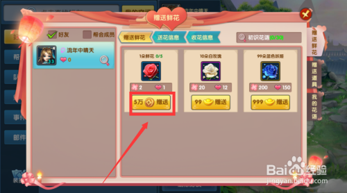 赠予鲜花的窗口,会显示花的数目可以增添几多的亲密度,点击赠予这一项。
