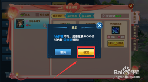 一朵鲜花可以用5万铜币采办,点击确定这一项。