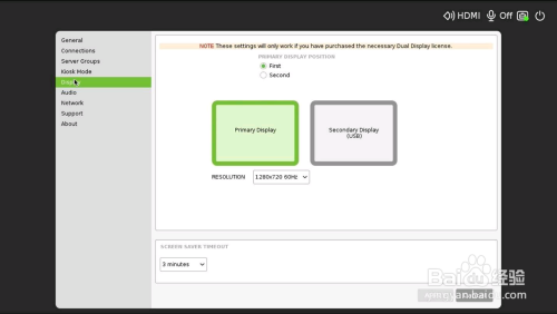 打开RX300电源。 确保您具有有用的双屏显示许可证。 在RX300的界面上单击齿轮图标,切换到Display选项卡, 您可以按照本身的爱好更改设置。我们建议您将本家儿显示器设为HDMI,辅助显示器设为VGA / DVI。 窗口顶部也将显示以下提醒信息,确认您拥有有用的许可证: