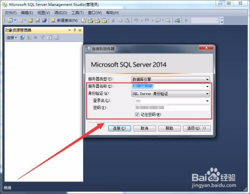 打开SQL Server 2014后,输入办事器名称,选择SQL Server身份验证选项,输入登录名和密码,登录SQL Server。