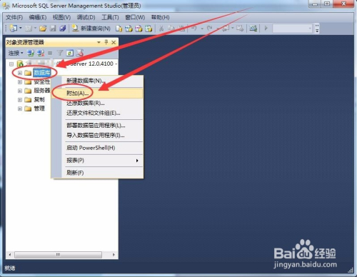 在左侧的对象资本办理器中,选择数据库节点,单击鼠标右键,选择附加选项。