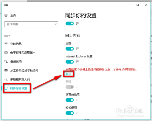 进入到同步设置页面今后,在左侧列表中选择【同步你的设置】,然后在右侧区域图示位置点击【验证】按钮。