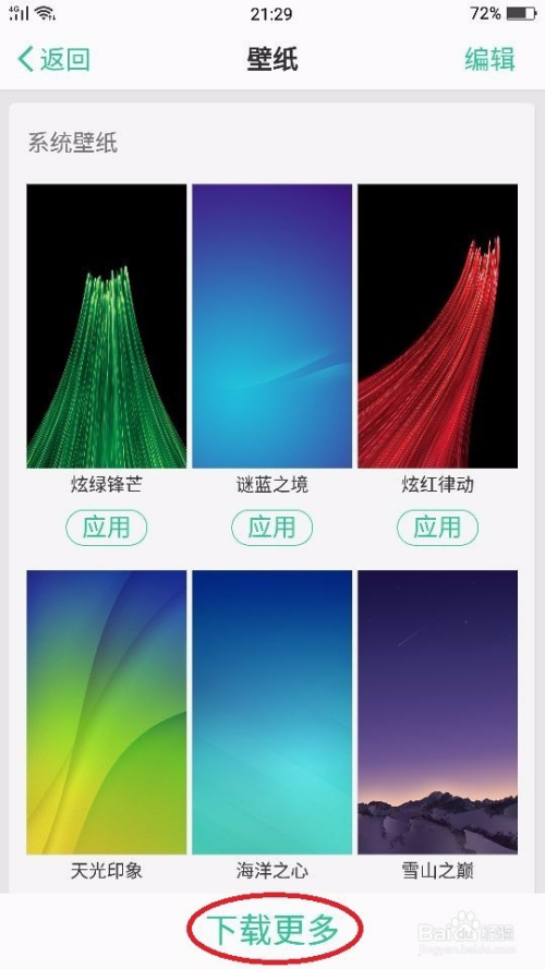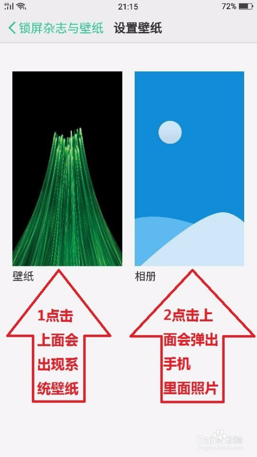呈现以下界面;点击左边【壁纸】会呈现系统供给的壁纸,点击右边【相册】,会呈现手机【相册】里供给的照片作为壁纸;