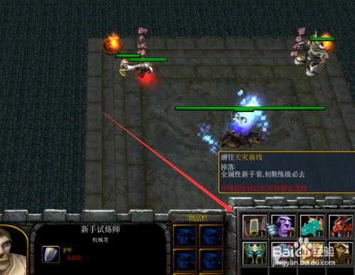 进修好技术后,直接点击基地左上角的新手试练师NPC,然后在点击进入天灾火线刷怪进级,如下图所示。