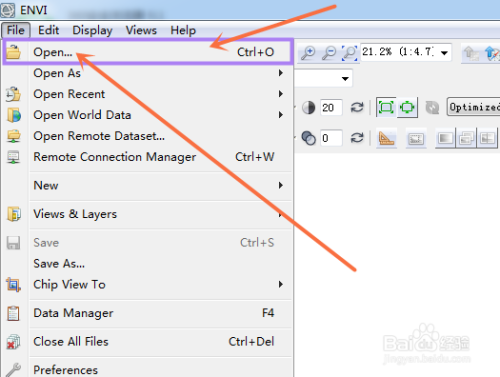 点击envi软件本家儿界面File,点击Open打开图像文件,如图所示