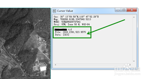 点击后,即可呈现Cursor value的对话框,显示鼠标(光标)地点位置的DN值(data)和行列号File,如图所示