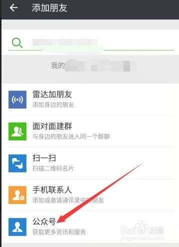 添加界面有多项,可以经由过程号码检索到对应小我,这里需要利用公家号,点击下方箭头指的该内容按钮,进行此类账号查找。