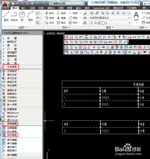 接着经由过程左侧【T20天正建筑软件V4.0】东西栏,依次选择【文字表格】》【表格编纂】》【归并表格】选项。