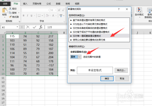新建法则,选择独一值、反复值,设置格局为反复。再单击格局,可以对显示的反复样式设置显示格局。