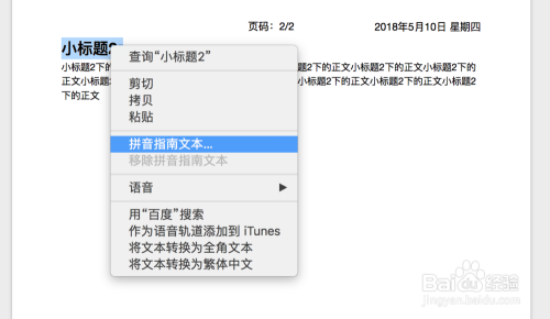选中想要添加拼音注释的文本,点击鼠标右键,从鼠标右键菜单中选择拼音指南文本: