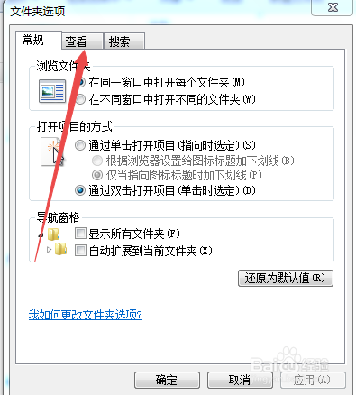 之后会弹出文件夹选项,切换到查看选项卡。