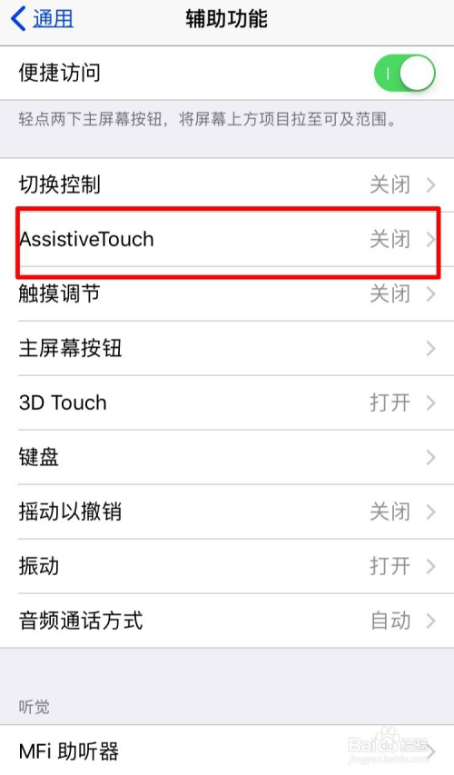 进入到【辅助功能】的界面,一向往下拉动页面找到【AssistiveTouch】并点击一下。
