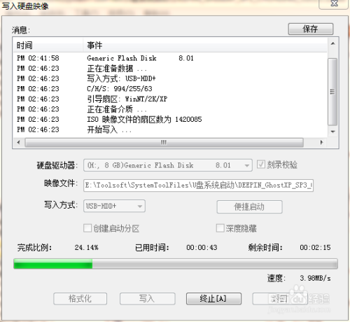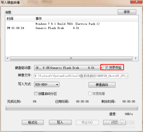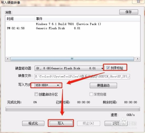 为包管刻录无误建议勾选 刻录效验,写入体例:USB-HDD+,点击"写入"