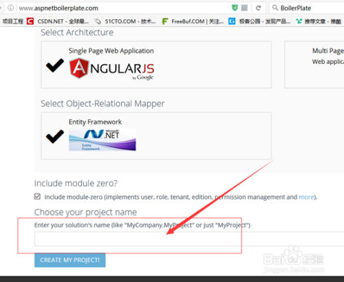 首先进入官方网站:http://www.aspnetboilerplate.com/,输入你的项目名称,ABP官网会主动生当作项目文件压缩包,如下图所示: