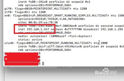 在mac的终端界面利用号令ifconfig查看一下mac的IP地址信息,从下面图中可以看到,ip地址是192.168.1.247.