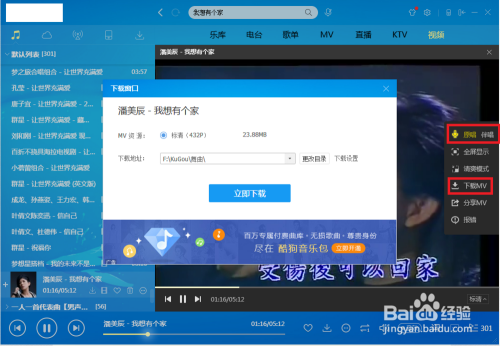 点击打开的原唱视频之后,把鼠标移动到视频的右侧,这时就会呈现原唱和伴唱的选项(要找到原唱和伴唱选项都能选择的MV)——点击下载——设置好下载地址之后,点击当即下载就可以下载了。