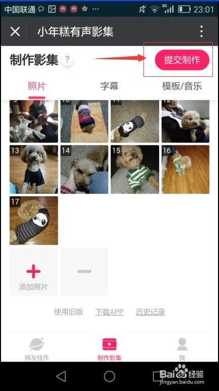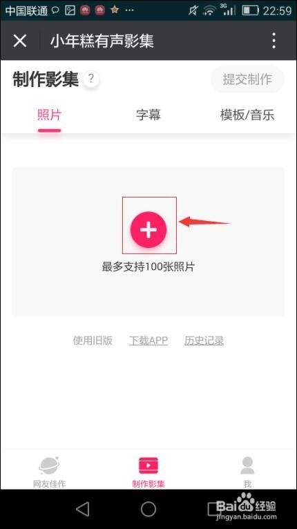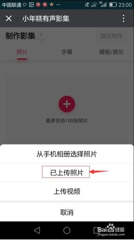 若是是第一次利用,请选择从手机相册选择照片,若是事先已上传了照片,请按已上传照片,也可以选择上传视频,将视频添加进来。我们选择已上传照片;