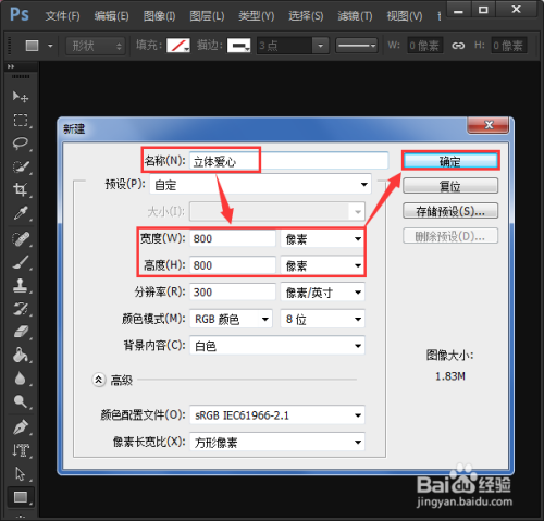打开ps软件,新建一个800*800像素的白色画布,【定名为:立体爱心】便利保留之后查找,点击【确定】按钮。