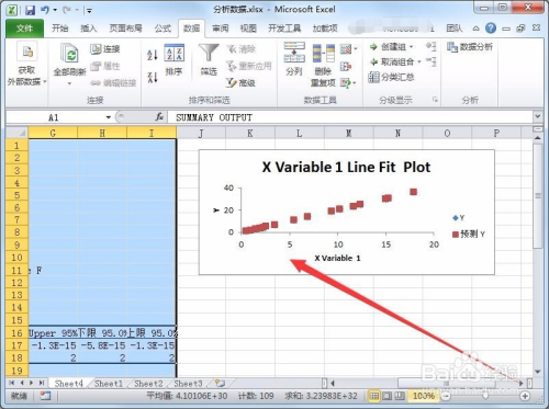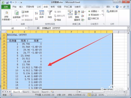 Excel会新建一个数据表,数据表中显示各项阐发成果,例如尺度误差、不雅测值、回归阐发、残差等,还会显示不雅测值、展望、残差表格。