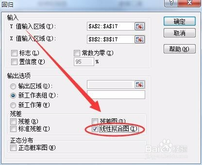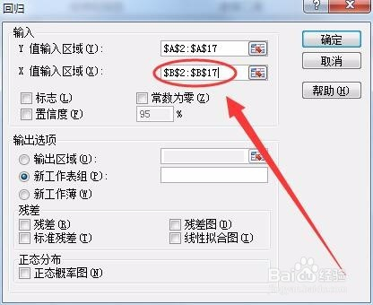 用选择Y值输入区的方式,选择X值的输入区,本例选择X值的区域为B2:B17。