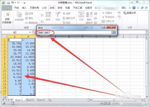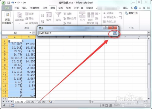 在呈现的窗口中选择Y数据的区域,本人选择了A2:A17区域。