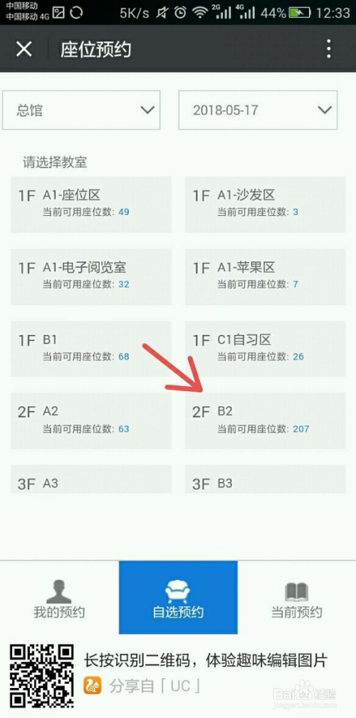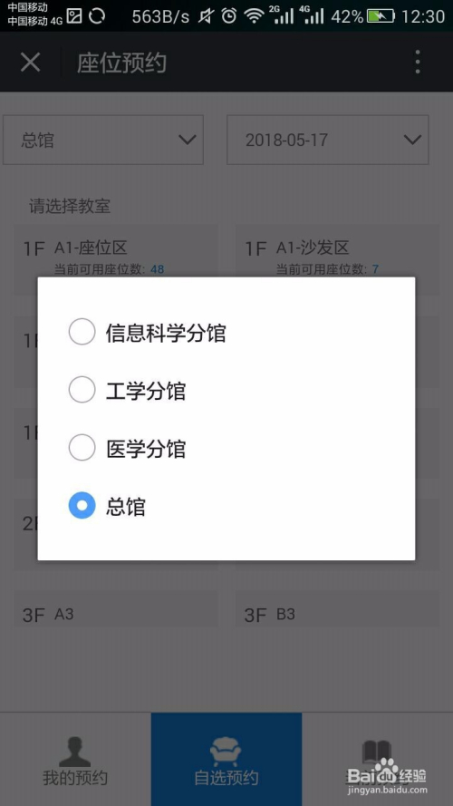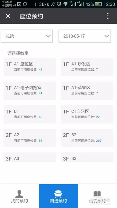 3.绑定完当作后继续点击“我”-“座位预约”,在弹出的预约界面中选择你想去的藏书楼