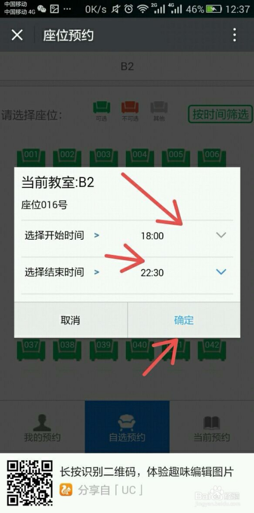 4.好比我选择总馆-2F B2(B2区2楼),选择一个座位号,好比016,然后选择起头时候与竣事时候,然后确认