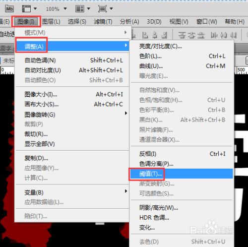 设定阈值:图像→调整→阈值,阈值色阶选择默认值即可。
