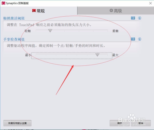 在Synaptics节制面板中进行触摸激活阈限和手掌查抄阈值的设置,如下图所示: