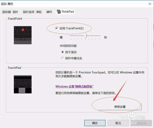 在ThinkPad选项卡中,找到TouchPad,并点击高级设置,如下图所示: