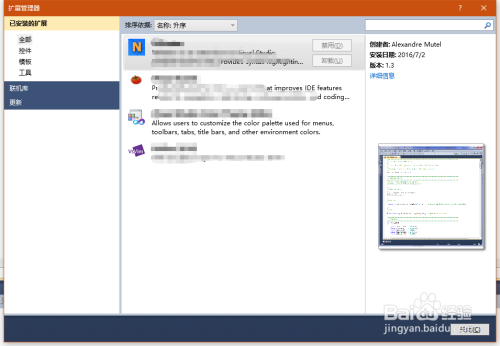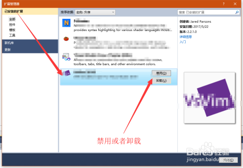 6. 打开【扩展办理器】,找到【已经安装的扩展】,查看已经安装好的插件。也可以禁用或者卸载。