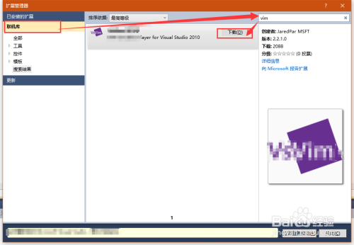 4. 步调3后,在弹出的【扩展办理器】窗口中->【联机库】,输入需要下载的插件,搜刮成果如图所示,点击下载。